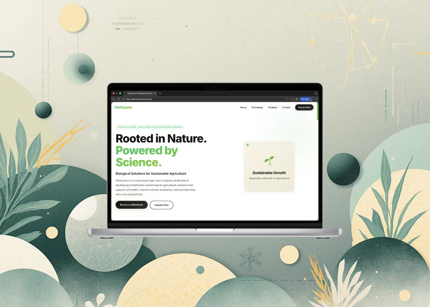 A corporate website for Fertizyme, presenting their agricultural solutions and fertilizer products with an emphasis on sustainability and innovation.